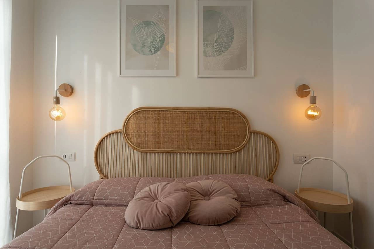 For the bedside tables, Fermaluce lights with soft and golden bulbs were chosen, contributing to a welcoming and relaxing atmosphere. Again, the wall lights have wooden details, maintaining the aesthetic coherence of the space.