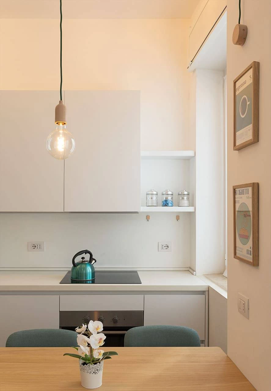 In the living room, all the lights have visible green cables. This choice is not accidental: the green echoes the tiles and wallpaper in the room, creating a harmonious and coordinated effect. It also provides a cozy and natural feel, thanks to the wooden rosettes and lamp holders. Above the sofa bed, a lamp with an adjustable height system has been installed. This way, it can be positioned lower for comfortable reading or higher to illuminate the entire room.